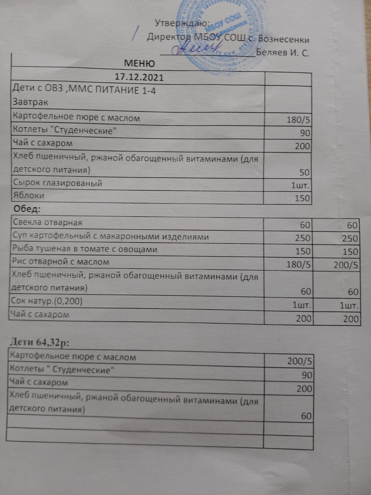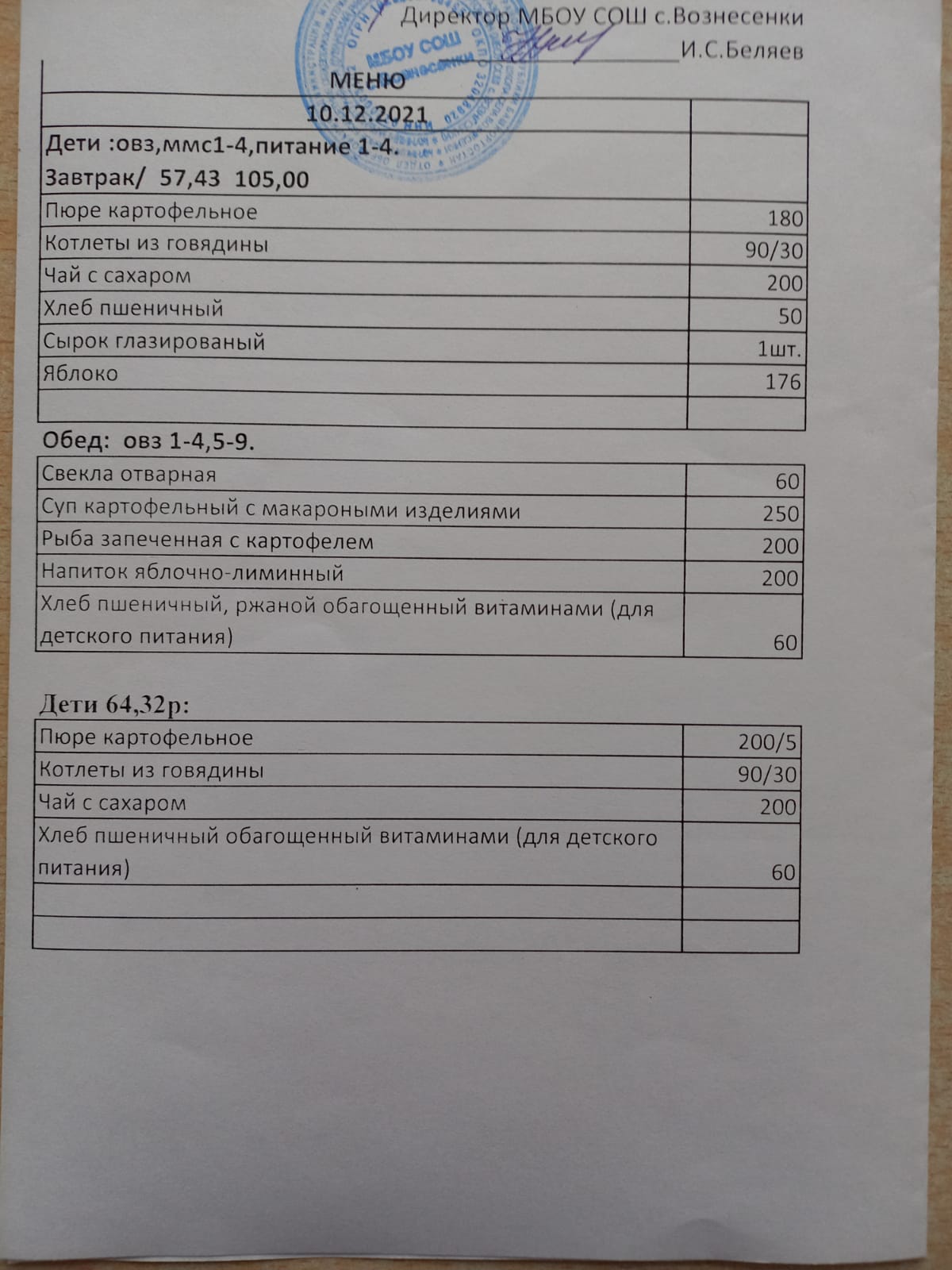(завтрак 1-4 классы)